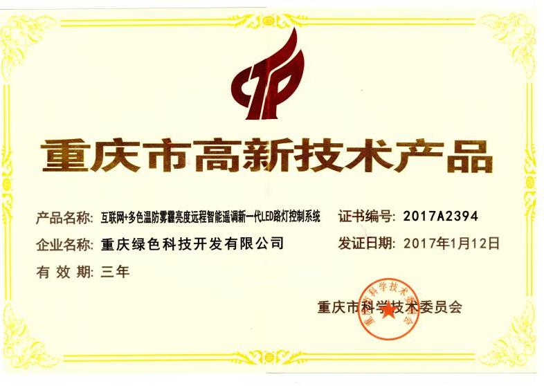 我司研發、制造的“互聯網+多色溫防霧霾亮度遠程智能遙調新一代LED路燈控制系統”榮獲市高新技術產品認證