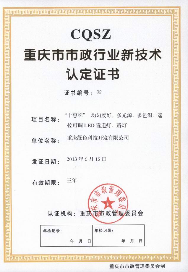 《市政行業新技術認證證書》 (“十惠牌”均勻度好、多光源、多色溫、遙控可調LED隧道燈、路燈)